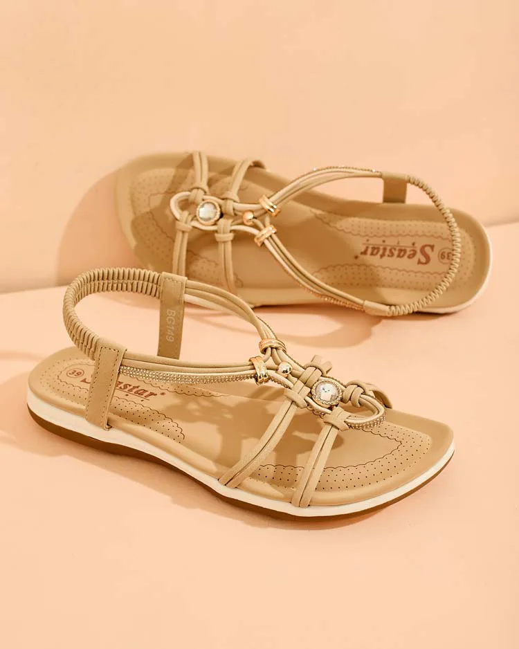 - Women's sandals on a flat sole - an ideal idea for hot summer days. The model entirely made of ecological leather. The upper decorated with rhinestones and decorative zircons.