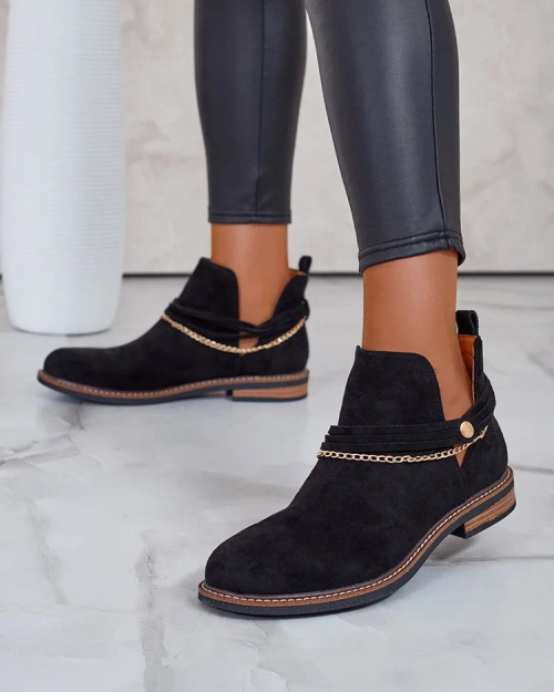 - Stylish women's eco-suede boots with natural leather insole are ideal for colder days. Slip-on model with decorative chains on the upper. Footwear on a flat heel and with a round toe. Super addition to your casual outfits!