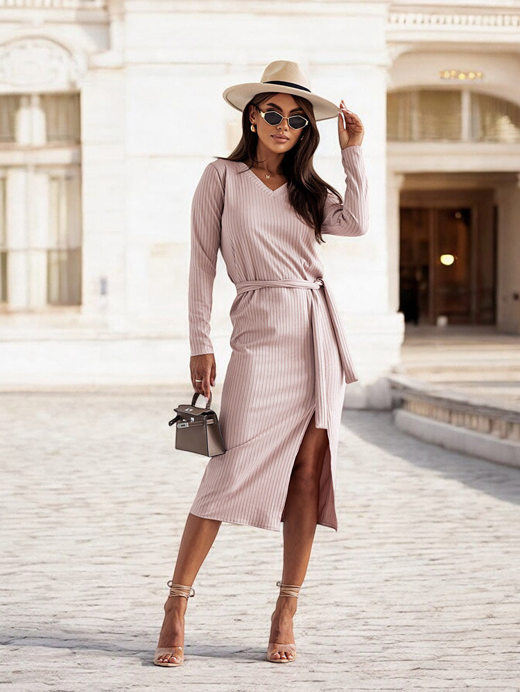 - Women's mid-calf dress , with long sleeves and a heart neckline. The model has a ribbed fabric and an elegant slit to mid-thigh. In addition, a belt included. Must have of this season! NOTE: Measurement accuracy (+/-) 1 cm.