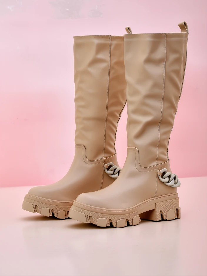 • Women's knee-high boots, made of ecological leather. The model is on a flat heel. The footwear is slip-on. They have a non-removable decoration at the back in the form of a chain.
