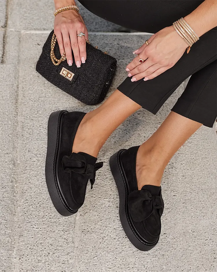 • Classic women's moccasin-type half shoes on a small platform. Model made of ecological suede leather and eco leather insole. Must have in every woman's closet!
