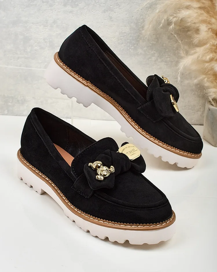 - Classic women's moccasins on a small platform. The model is made of suede ecological leather and an eco-leather insole. The toe is decorated with a bow. A must-have in every woman's wardrobe!