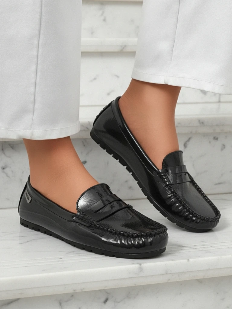 - Classic women's moccasins on a flat sole, made of patent ecological leather. Inside, a natural leather insole with soft cushions. Very light and comfortable!