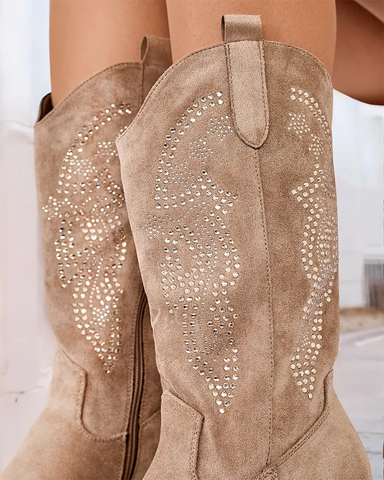 • Boots a'la cowboy boots with a low heel, made of organic suede leather decorated with zircons. The inside is lined with soft fur, boots with a zipper to the middle of the calf. They fit to many women's styling!