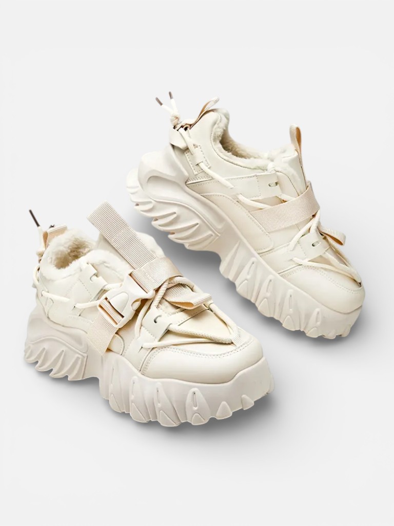 • Women's sporty sneakers on a thicker sole. Lace-up upper, made of ecological leather. Interior fully insulated with fur. Ideal for sports outfits!