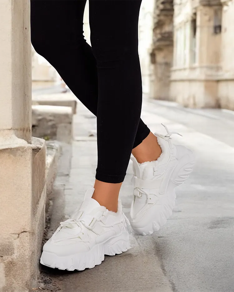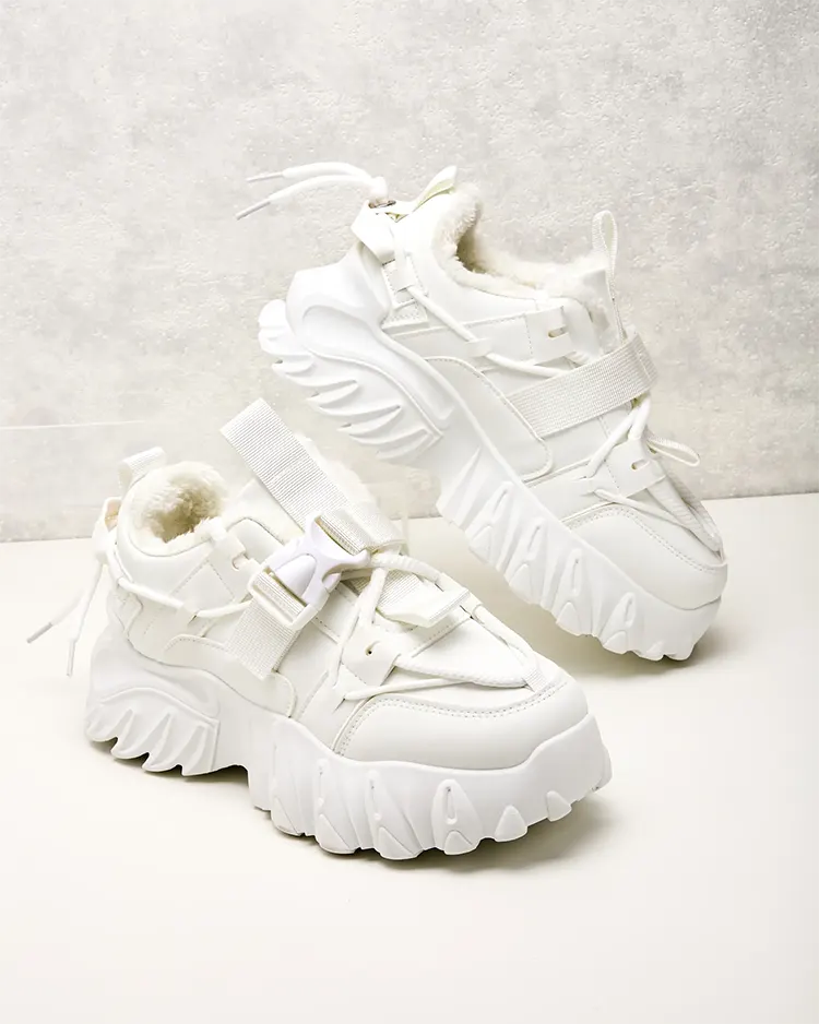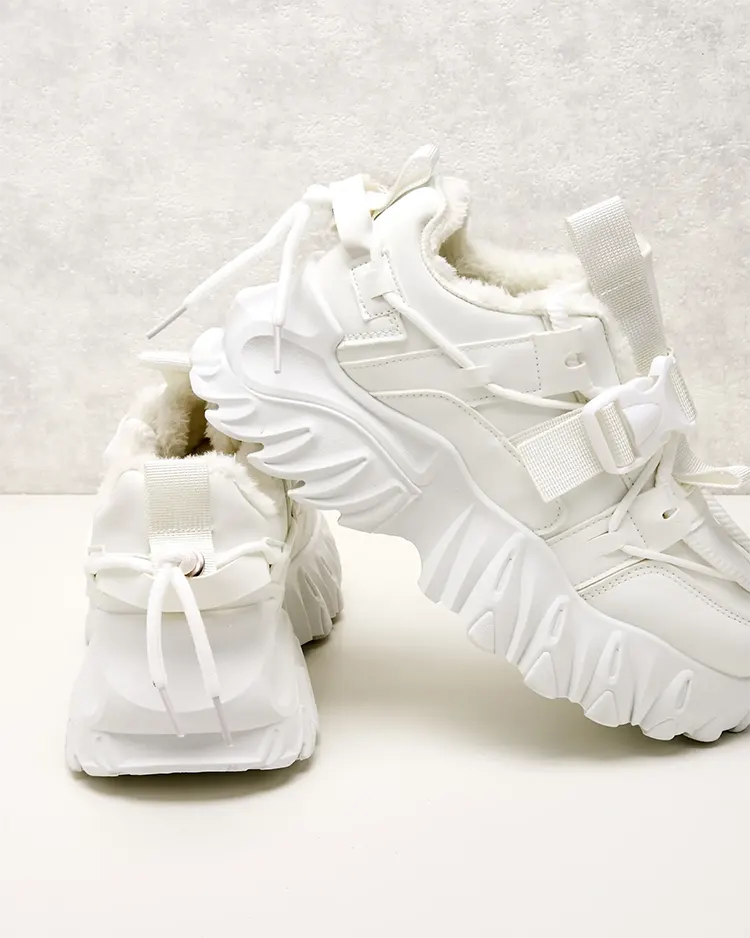 - Women's sporty sneakers on a thicker sole. Lace-up upper, made of ecological leather. Interior fully insulated with fur. Ideal for sports outfits!