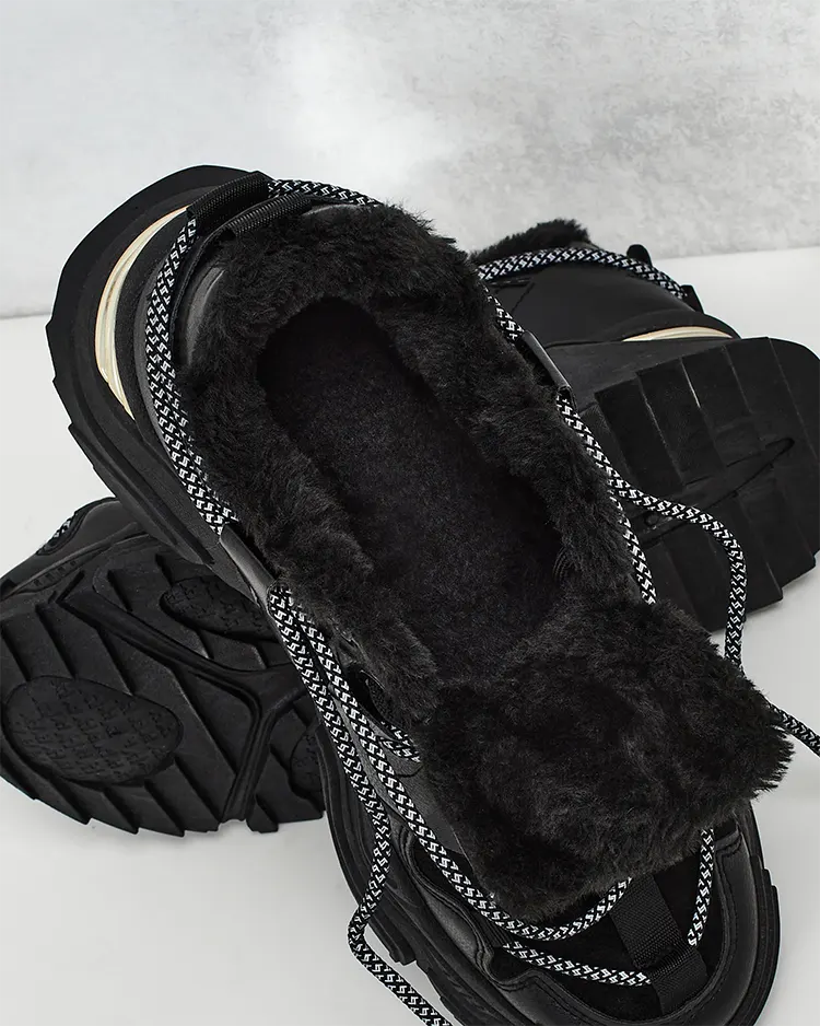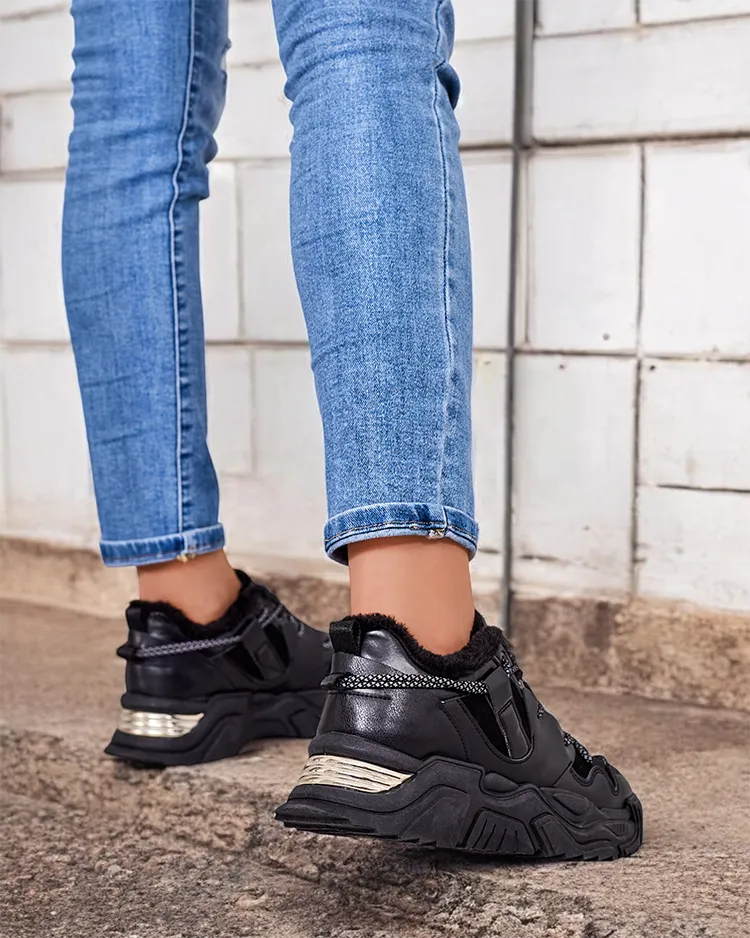 - Women's sporty sneakers on a thicker sole. Lace-up upper, made of ecological leather. Interior fully insulated with fur. Ideal for sports outfits!