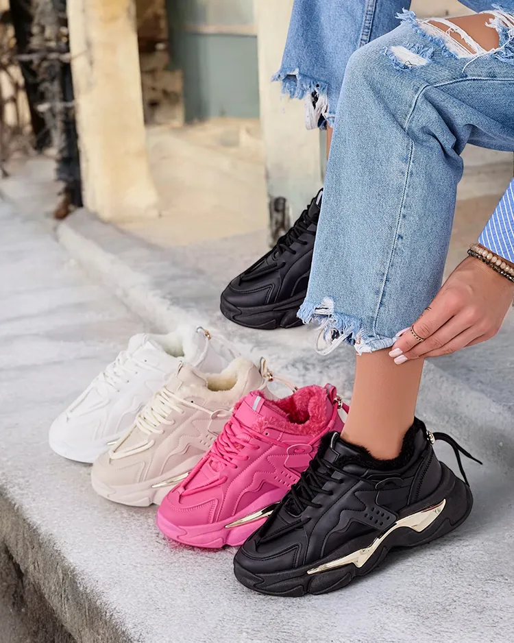 - Women's sporty sneakers on a thicker sole. Lace-up upper, made of ecological leather. Interior fully insulated with fur. Ideal for sports outfits!