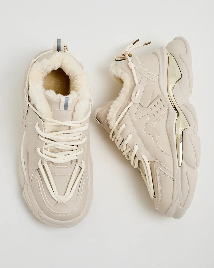 - Women's sporty sneakers on a thicker sole. Lace-up upper, made of ecological leather. Interior fully insulated with fur. Ideal for sports outfits!