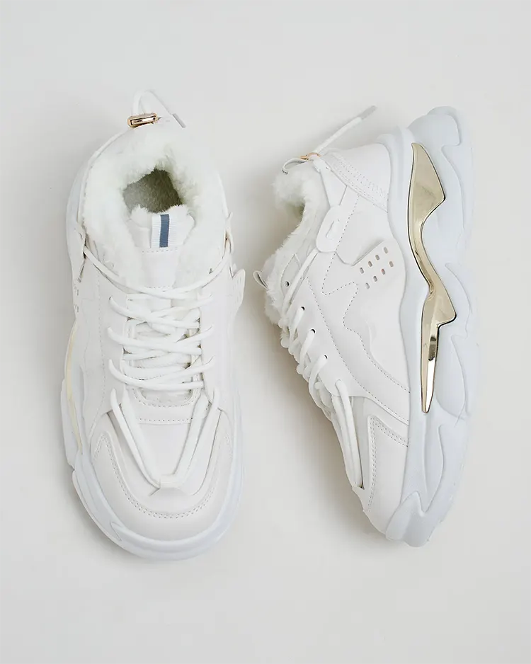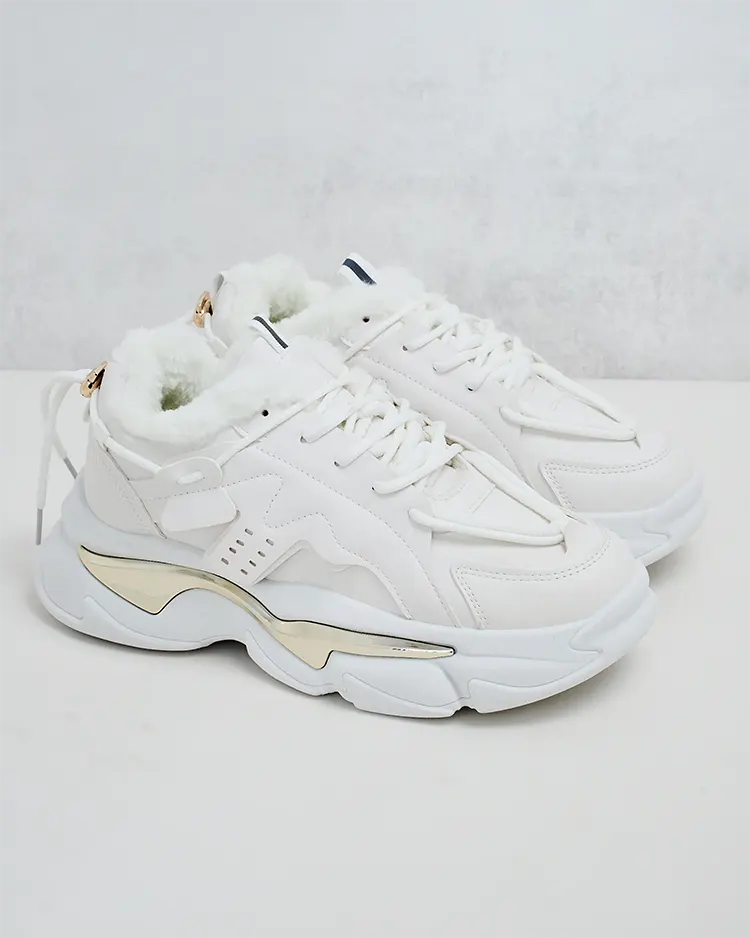 - Women's sporty sneakers on a thicker sole. Lace-up upper, made of ecological leather. Interior fully insulated with fur. Ideal for sports outfits!