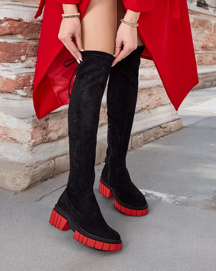• Long women's boots on a thicker sole, upper made of eco-suede. The model has a fur insole. The boots are zippered to the middle of the calf and have a welt. Perfect base for many winter outfits!