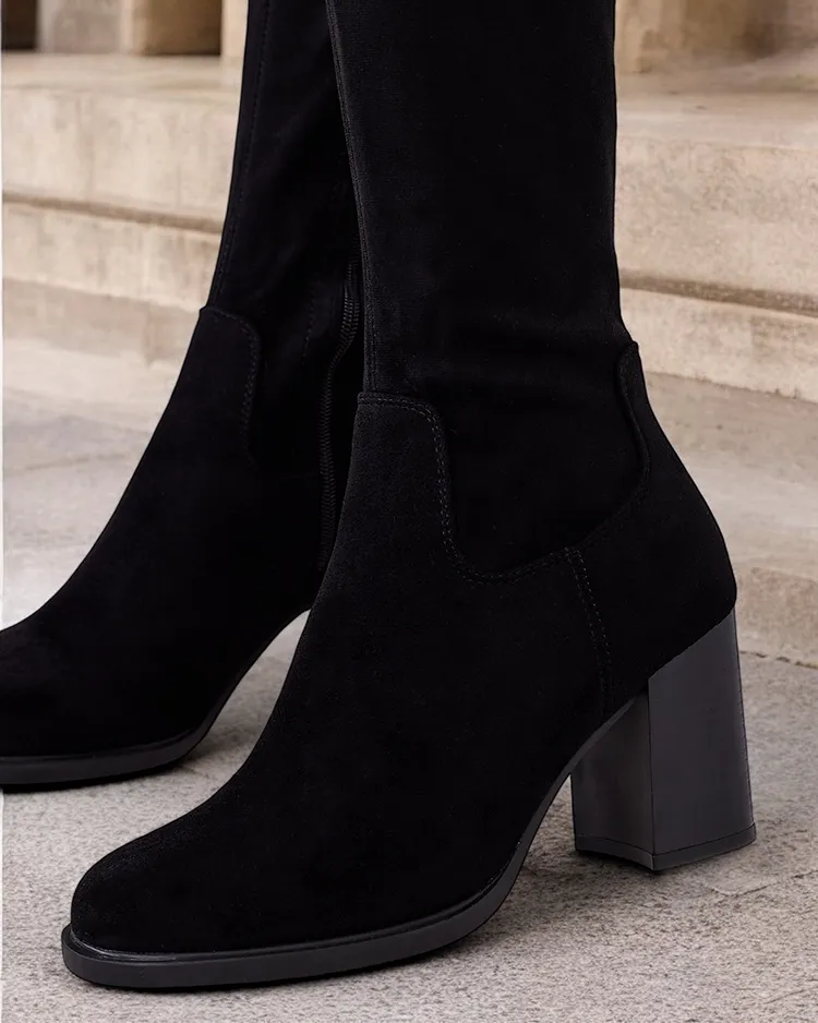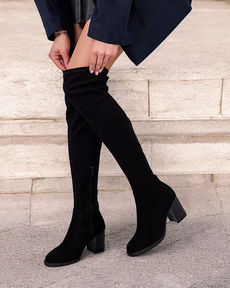 - Stylish women's boots with a post and over-the-knee upper. The upper is made of organic leather and has a fur insole. The model is fastened with a zipper. Perfect for creating elegant outfits!