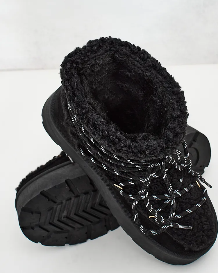- Women's snow boots with an upper made of a combination of eco suede leather and a' la sheepskin material. Lined with fur inside, slip-on and lace-up footwear. Perfect for winter!