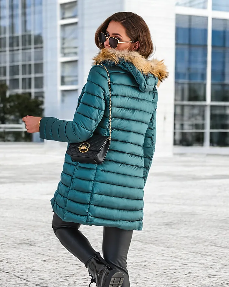 • Warm quilted women's winter jacket. The jacket has a detachable hood with non-detachable fur and two pockets. It is fastened with a zipper. Model filled with synthetic down. Perfect for winter!