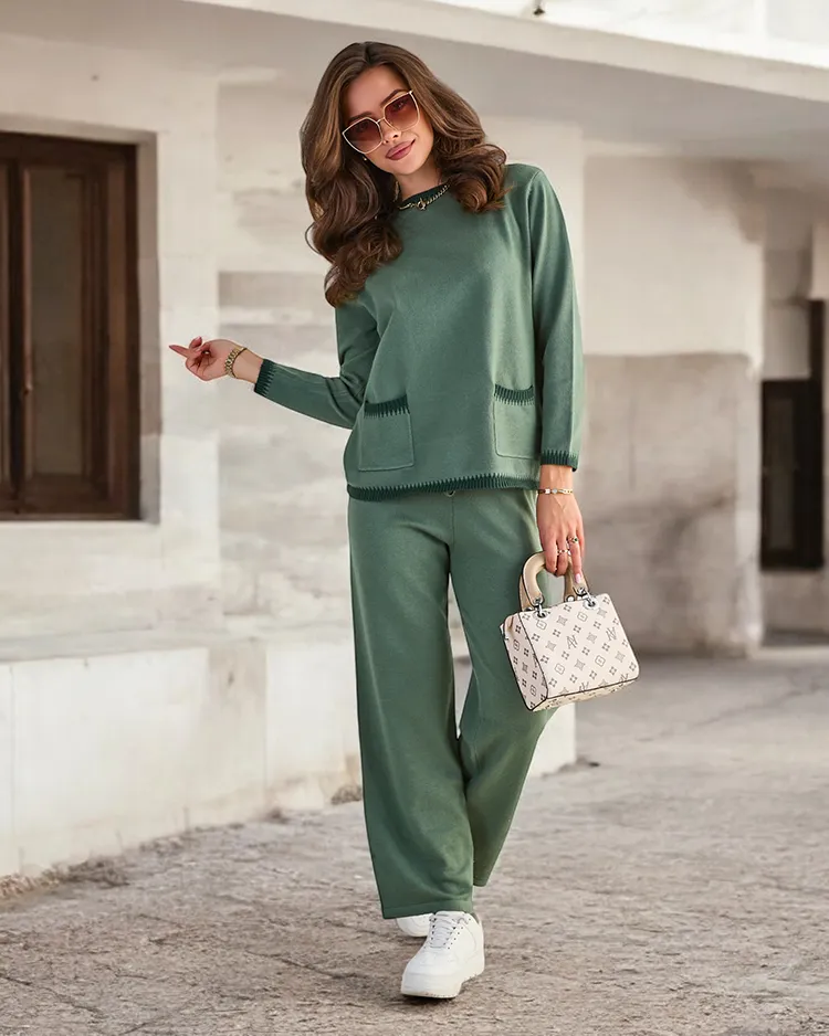 - Women's sweater set made of pleasant fabric. The sweater with a round neckline, has long sleeves. The wide pants are with elastic and ties at the waist. Must have of this season! NOTE: Measurement accuracy (+/-) 1 cm.