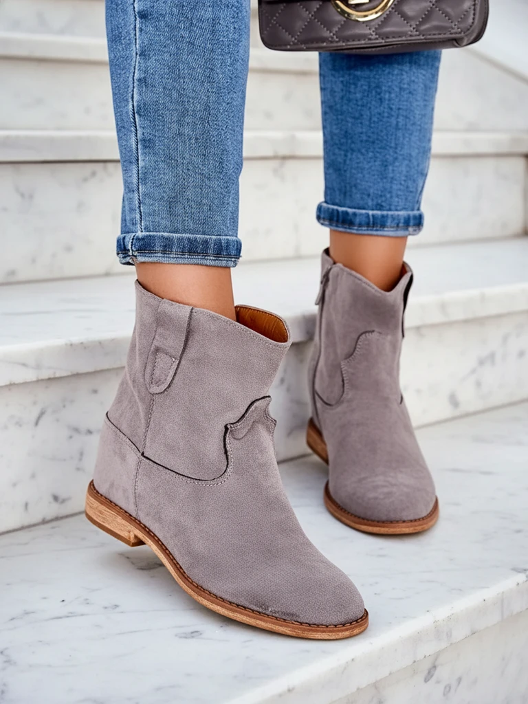 • Beige Western-style boots made of suede-like ecological leather. The model has insulation inside in the form of soft fur. Footwear on a low covered wedge. Shoes fastened with a zipper.
