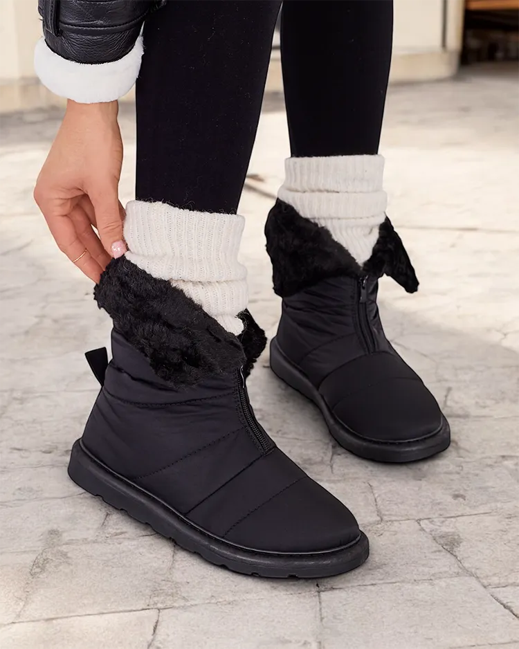 - Women's snow boots with an upper made of material similar to waxcloth. Inside, there is a fur lining, and the footwear has a zipper in the middle. Perfect for colder seasons!