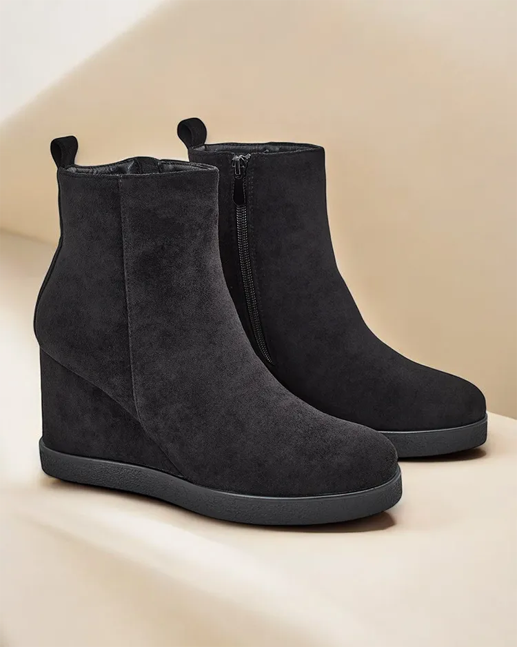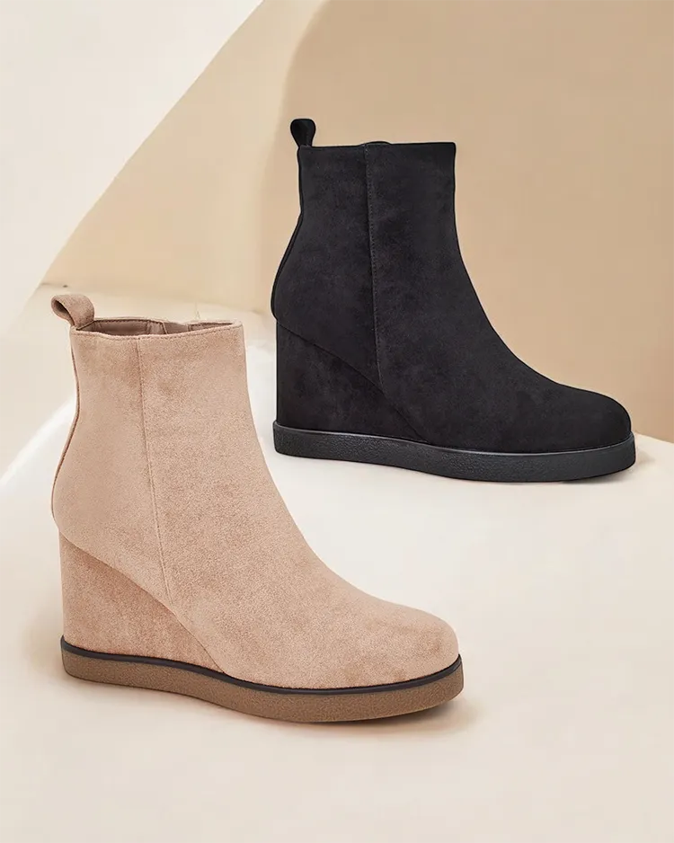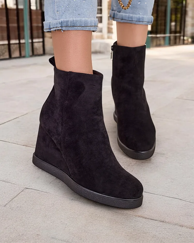 • Elegant women's wedge boots, made of eco-suede. Shoes lined with fur from the inside. Perfect choice for autumn!