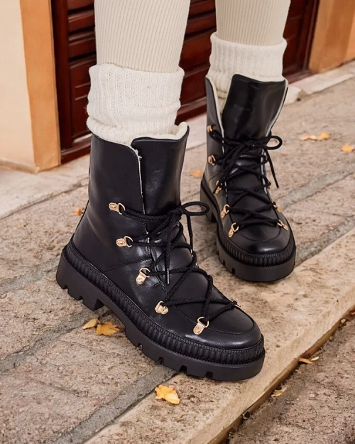 - Women's snow boots with a shaft made of eco leather. Lined with fur inside, lace-up shoes. Perfect for winter!