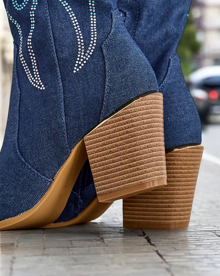 • Cowboy-style boots with heels, made of suede-like synthetic leather. Eco leather insole, shoes fastened with a zipper, shaft decorated with rhinestones. They match many feminine styles!