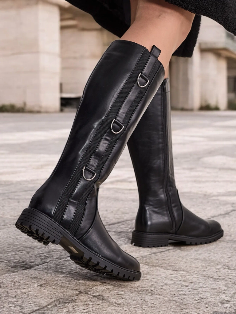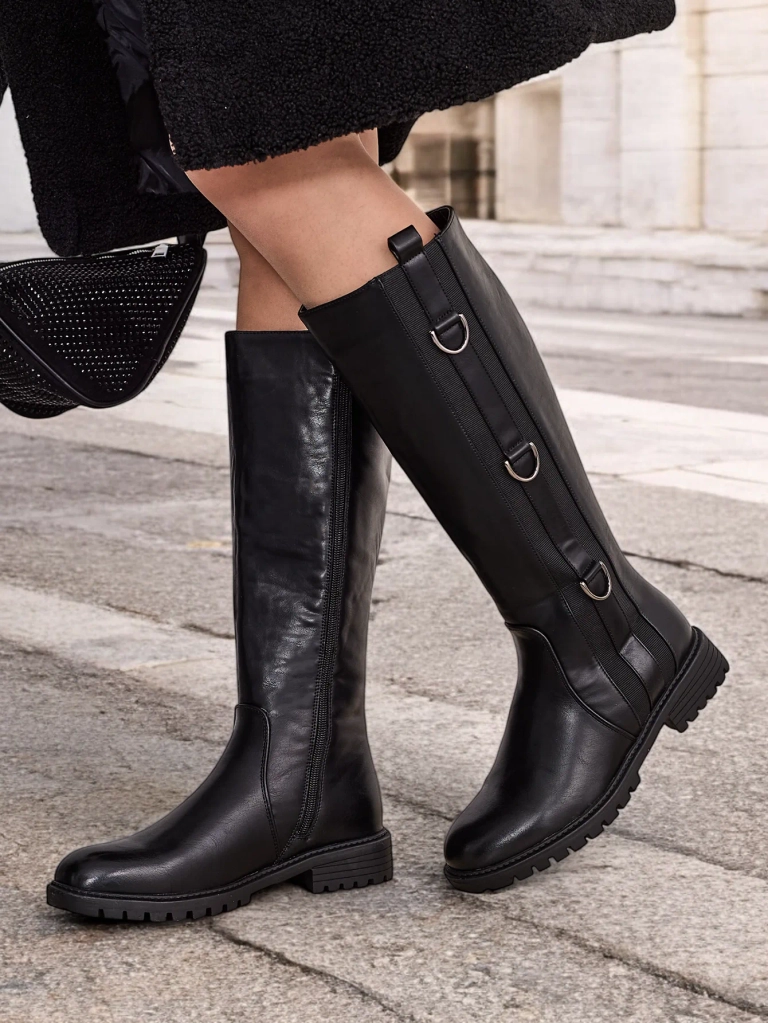 - Women's knee-high boots, made of eco leather. Model on a flat heel. Shoes fastened with a zipper. Fabric insole. They have an elastic insert on the side.