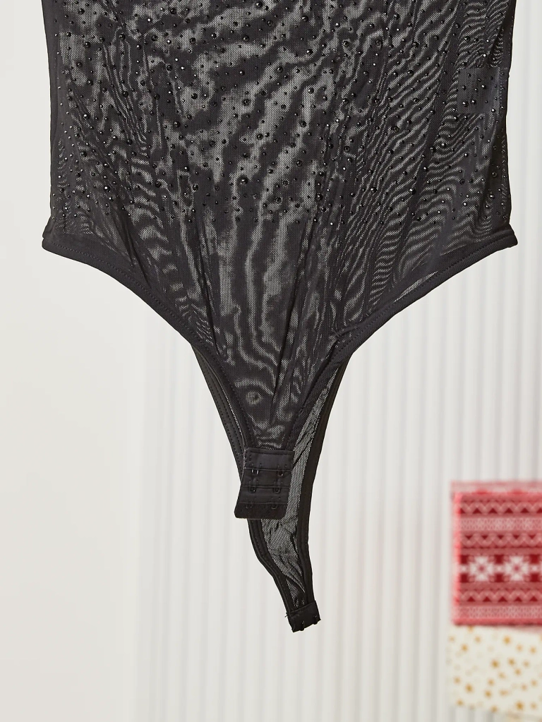 - Body made of mesh with zircons giving them elegance. Long sleeves add subtlety. Fastening with hooks ensures a perfect fit. Perfect for an evening full of sophisticated shine. ATTENTION: Measurement accuracy (+/-) 1 cm.