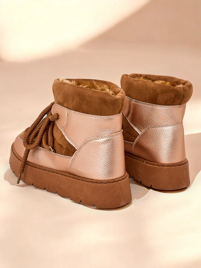 - Women's snow boots with a shaft made of a combination of eco leather and eco suede. Inside pleasant fur, slip-on and lace-up footwear. Perfect for winter!