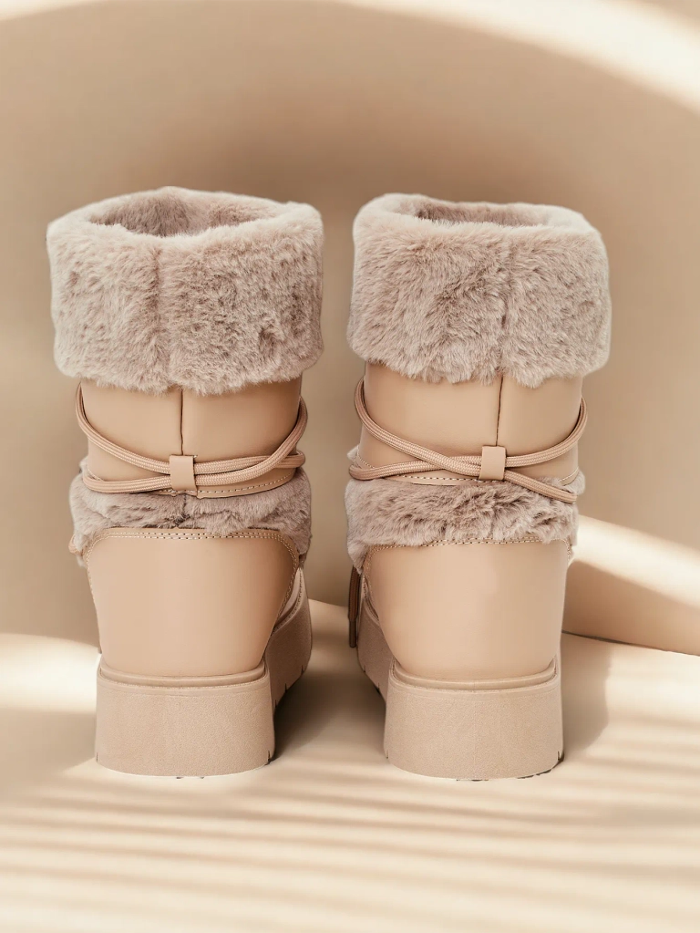 - Women's snow-type shoes with a shaft made of a combination of eco-leather and pleasant fabric. Inside there is a pleasant fur lining, the footwear has a laced shaft. Perfect for winter!