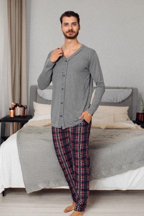 • Exceptional men's pajamas made of cotton material. The model has long sleeves and legs. The top is buttoned. Comfort and elegance in one!