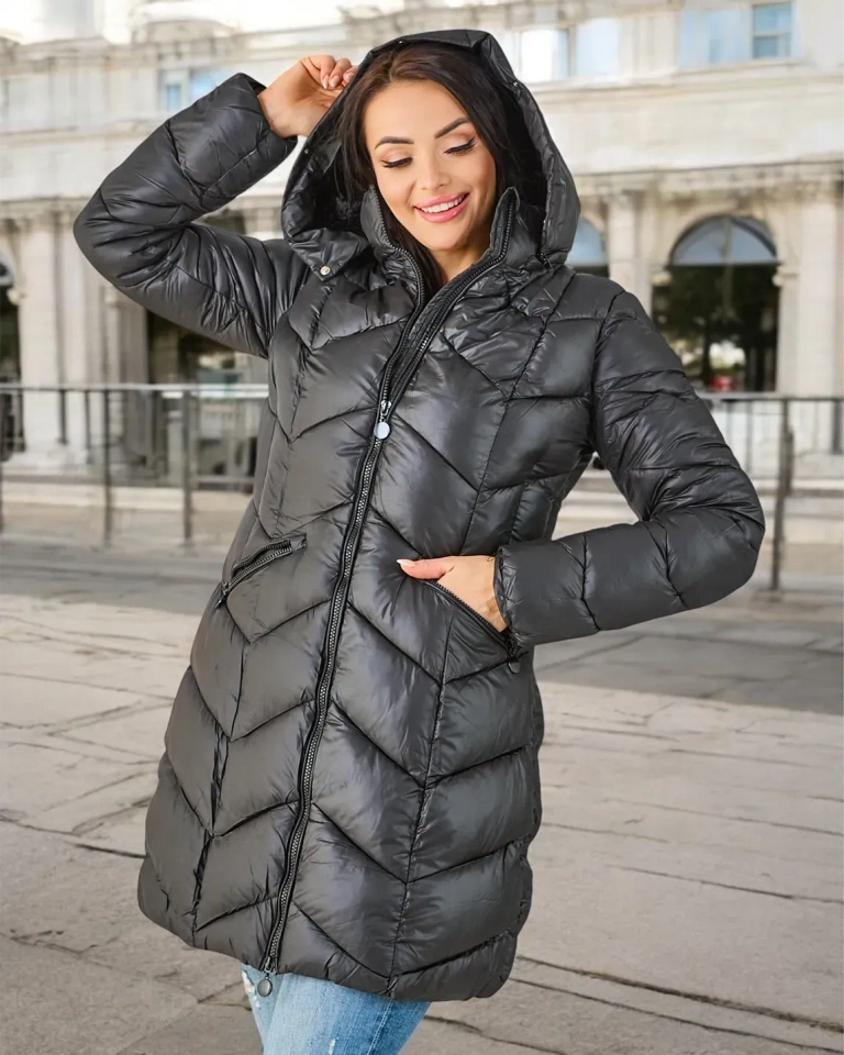 • Warm women's knee-length winter jacket with a detachable hood. Quilted model, has 2 zippered pockets and a zipper closure. The footwear is lined on the inside with fur and has synthetic down filling. Ideal for cooler days!