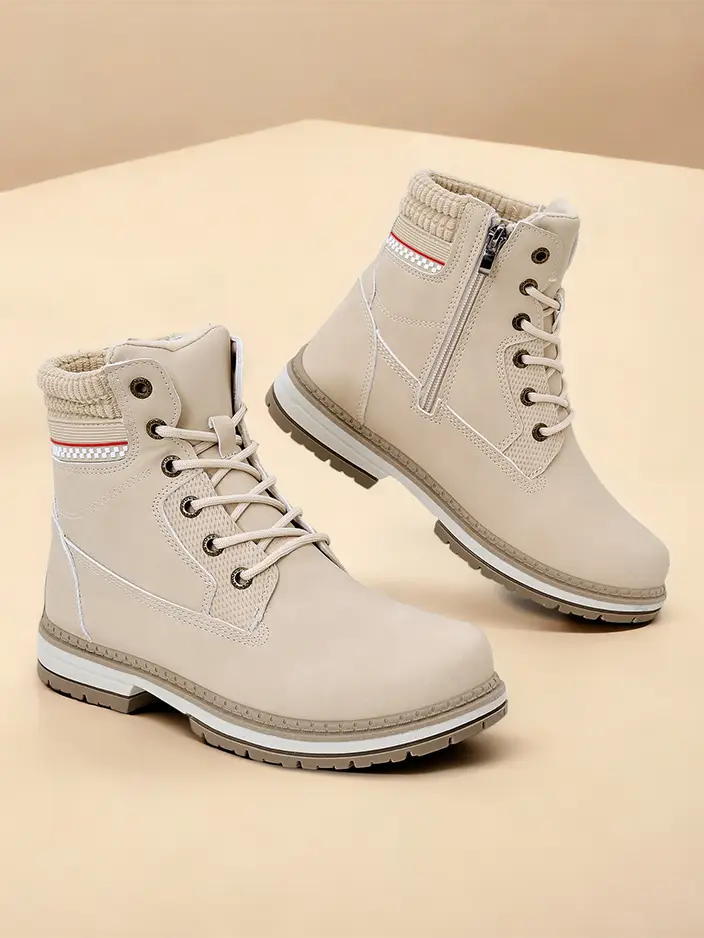 • Women's trekking boots with a lace-up upper and a side zipper. The material is eco-friendly leather. The inside of the boots is lined with fur. Perfect for winter!