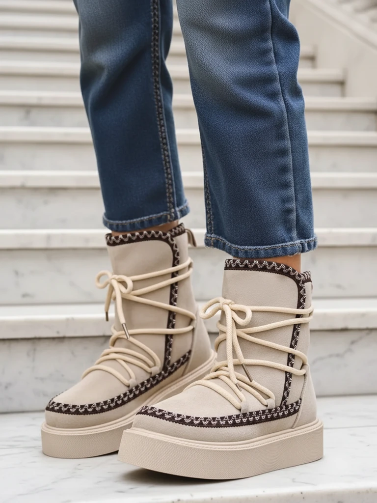 • Women's snow boots with an upper made of suede eco-leather. Inside, there is a delicate lining, and the boots are laced. Perfect for winter!