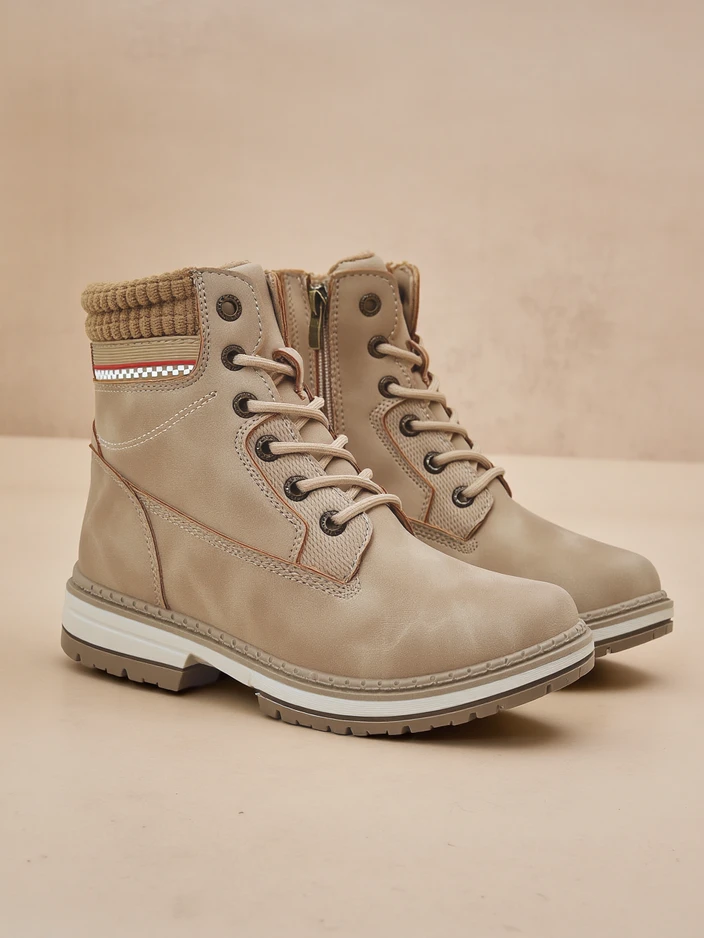 - Women's trekking boots with laced upper and a zipper on the side. The material is made of eco-leather. The inside of the shoes is lined with fur. Perfect for winter time!