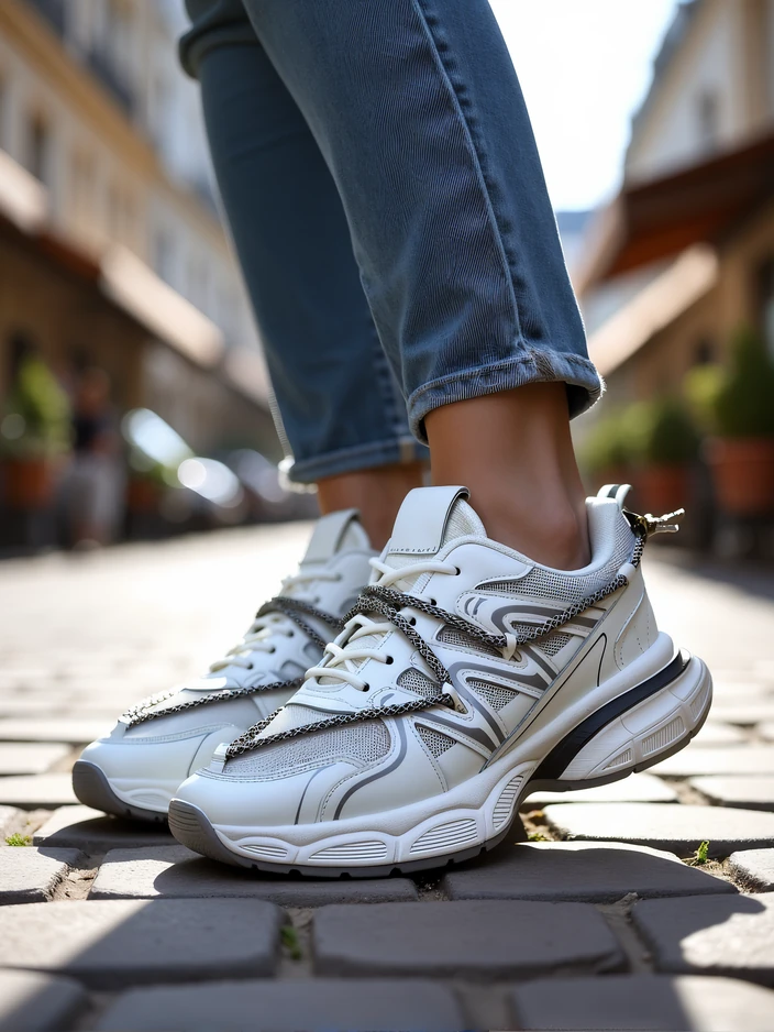 - Women's sports shoes in the form of sneakers with a thicker sole. Made of eco-leather and mesh with a fabric insole. A super addition to your everyday casual outfits!