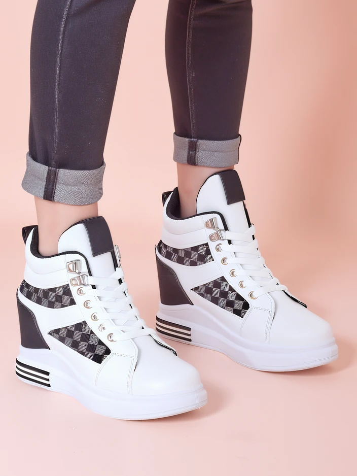 • Stylish women's platform sneakers made of eco-leather and fabric inserts with a print. Inside there is a soft fabric insole. The shoes are laced. They will be a great accessory for everyday outfits.