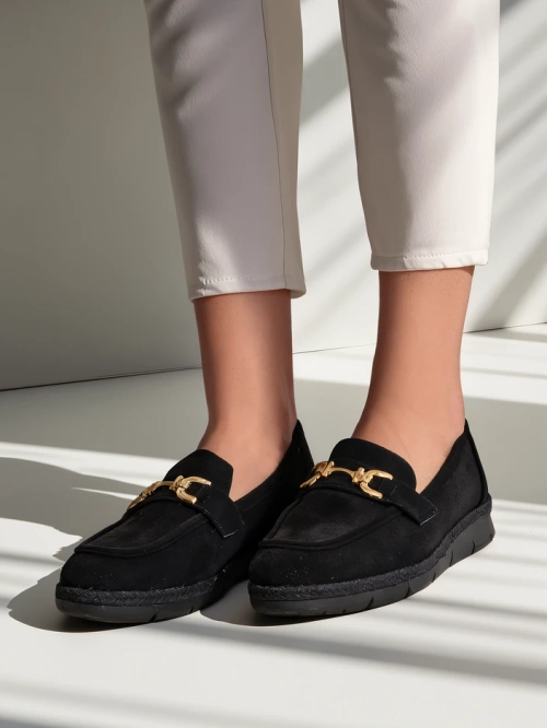 - Classic women's slip-on shoes with a flat sole. The model is made of eco-friendly suede and has an eco-leather insole. The toe is adorned with a subtle decoration. A must-have in every woman's wardrobe!