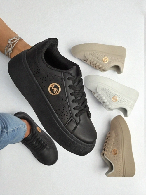 Perseida women's sneakers from Royalfashion are a combination of comfort, style and modern design. Made of high-quality ecological leather, which is environmentally friendly and easy to care for, these shoes impress with their openwork pattern and subtle elegance of the golden emblem. The soft fabric interior guarantees comfort throughout the day, perfectly wicking away moisture and preventing abrasions, even during intensive use in the spring, summer and autumn seasons. The production technology includes precise sewing and modern methods of embossing patterns, thanks to which the shoes are durable and resistant to everyday damage. The 5 cm high platform not only visually lengthens the figure, but also provides cushioning with every step, relieving the joints. Black, lace-up sneakers with a classic round toe are easy to match with a variety of styles. Outfit ideas: 1. Casual for everyday wear - combine sneakers with mom fit jeans, a white t-shirt and a short denim jacket. 2. Sporty elegance - pair with leggings, an oversized sweatshirt and a fashionable bum bag slung over your shoulder. 3. Minimal sport-chic - wear a flowy midi skirt and a short sweater with black sneakers, and complete the look with a classic messenger bag. Care: To keep your sneakers looking good for a long time, simply wipe them with a damp cloth and use a spray to clean and protect the eco-leather. Avoid prolonged contact with water. Dry at room temperature, away from heat sources. Fabric insoles can be gently refreshed with a damp cloth. Store in a well-ventilated place in the original packaging. Platform sneakers are an absolute must-have for the upcoming seasons! Minimalism in black, practical finish and universal design perfectly fit into the latest trends of urban style and sporty elegance. Stay up to date with Royalfashion and stand out with a fashionable detail every day!
