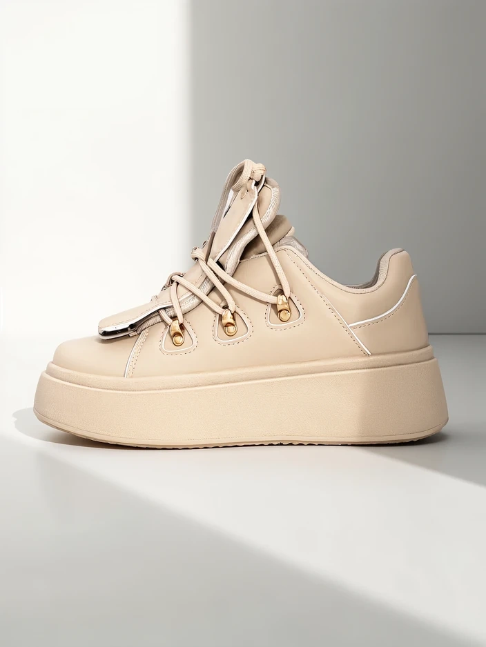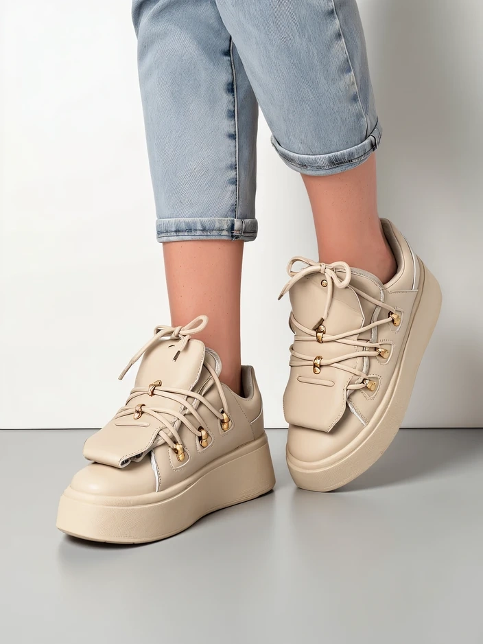 - Sports women's sneakers on a thicker outsole. Lace-up upper made of eco-friendly leather. The interior is made of pleasant fabric. The model features a decorative tongue. Perfect for everyday use!