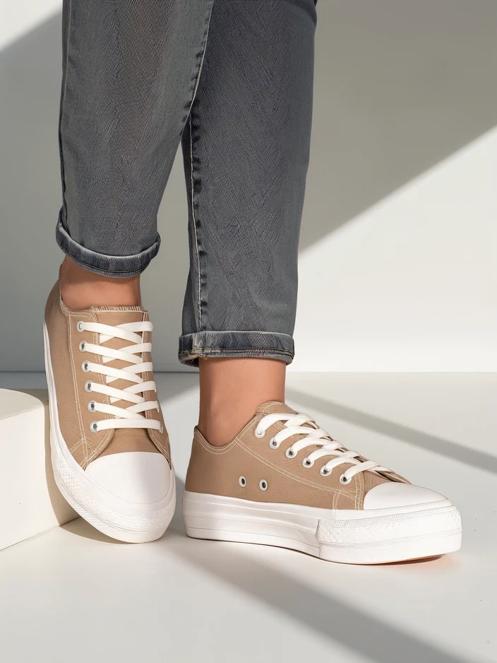 - Women's sneakers made of fabric material. Upper with decorative laces. Classic rubber sole. These shoes will be great for everyday wear!