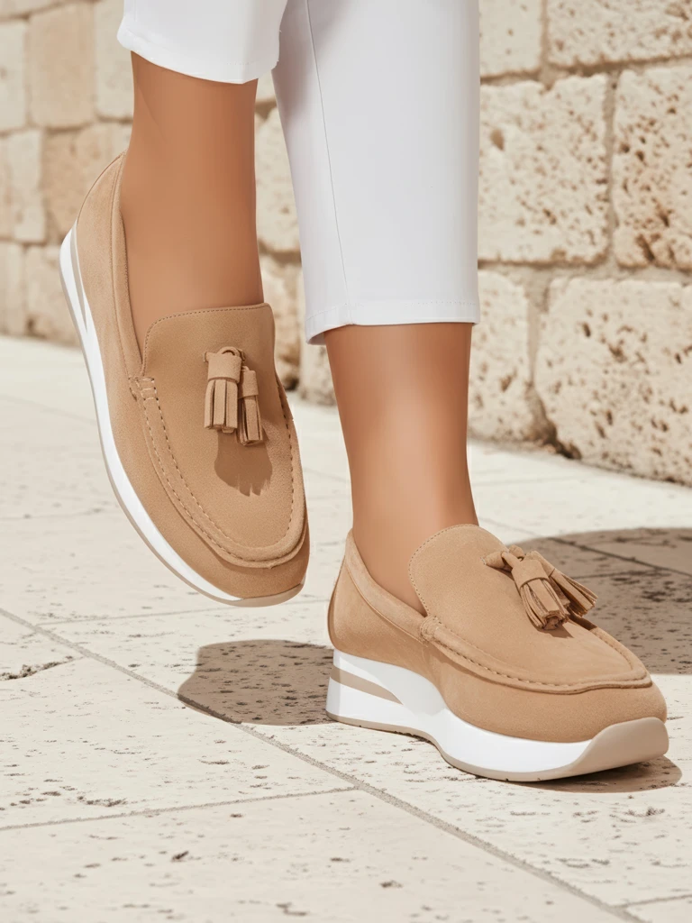 Aurelia Verde are fashionable women's moccasins, created from the highest quality eco-suede leather. This material is not only delightfully soft, but also an environmentally friendly alternative to natural suede. The moccasins are made with attention to detail, and modern gluing and molding technology has been used in the production, which ensures durability and comfort of everyday use. The insole is also made of delicate eco-leather, which guarantees comfort even when worn for many hours. Noteworthy is the flat wedge heel with a height of 4 cm - it provides excellent stabilization and a gentle lift to the figure without feeling tired feet. The shoes feature a modern green color and a subtle decoration in the form of tassels on the toe, which gives the styling lightness and a distinctive character. The moccasins are perfect for both urban styling and special occasions on warm spring and summer days. The unique benefits during use are primarily the lightness of the construction, breathability, and ease of putting on and taking off. The footwear adapts to the shape of the foot and is suitable for women who value comfort and fashionable, casual design. 1. For the office - wear moccasins with classic cigarette pants and an oversized shirt. 2. For a walk or shopping - pair with mom fit jeans and a white cotton t-shirt. 3. For a meeting with friends - choose a flowing midi dress and a light denim jacket. Clean the shoes with a dry suede brush. Avoid contact with water and store away from sunlight. It is recommended to use an impregnant for eco-leather - then the color and structure of the material will delight for longer. Green and the tassel motif are one of the hottest trends of the spring/summer season! Wedge moccasins are a must-have in the wardrobe of every stylish woman looking for a combination of comfort and original style.