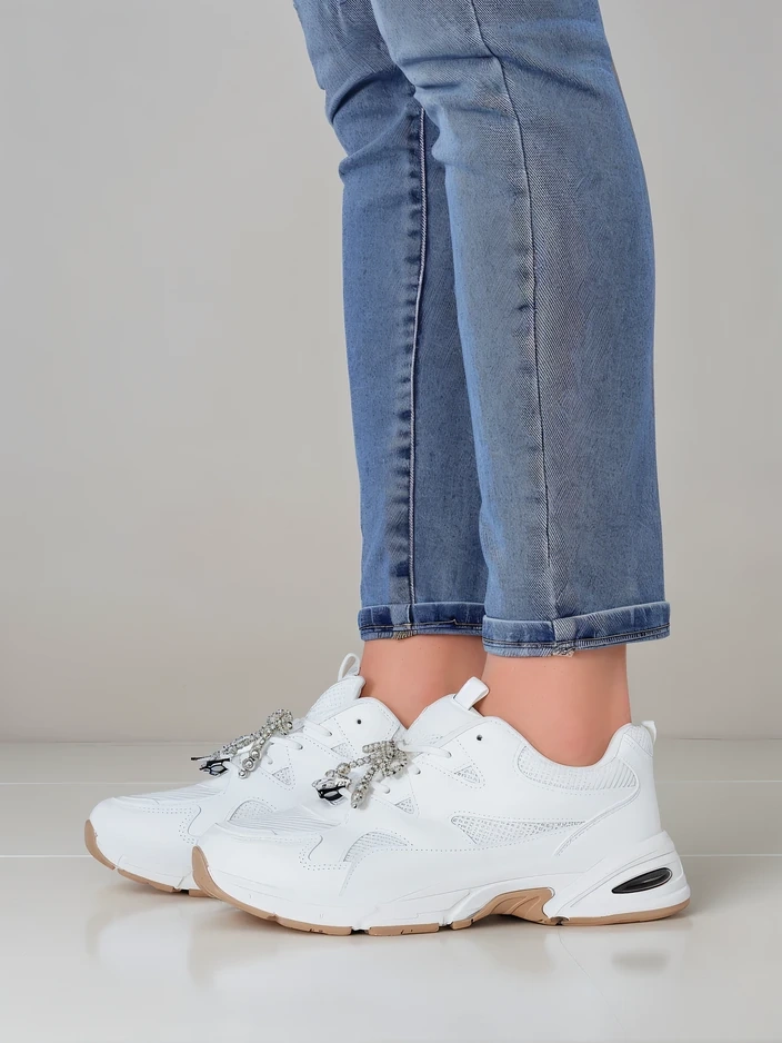 - Women's sports shoes made of eco-leather and mesh. Model on a thicker sole. Laced upper. They will go great with everyday styles! Adorned with a detachable chain.