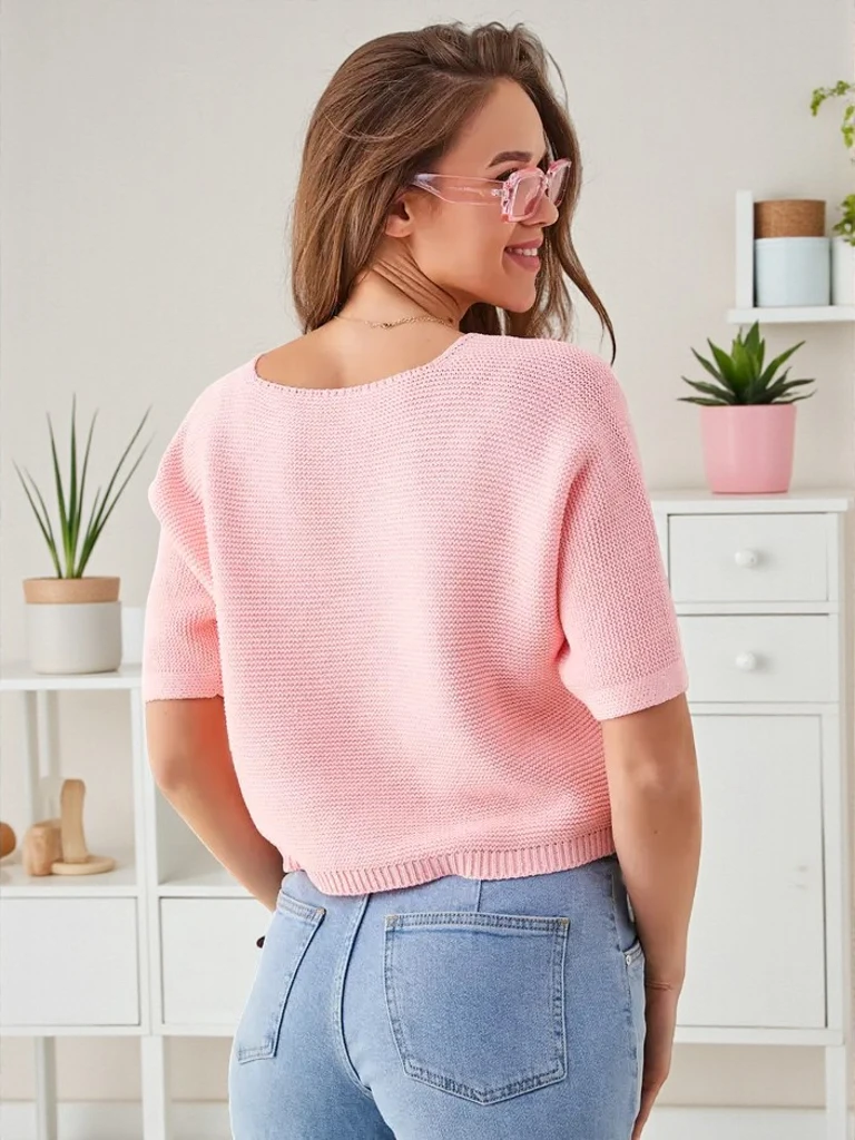 - Fashionable women's sweater made of soft fabric that provides comfort while wearing. The model features a V-neck and short sleeves. Additionally adorned with a subtle floral pattern, adding charm and femininity.