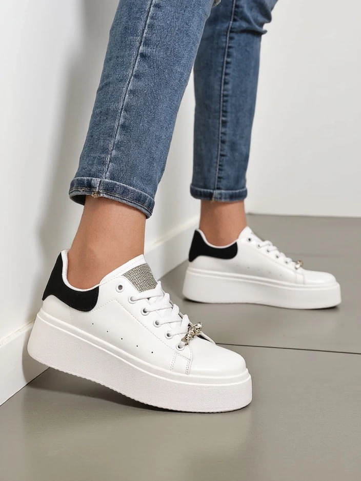 - Elegant white sneakers with sparkling metallic detail. Shoes made of eco-leather and fabric inserts. Perfect for casual outfits.