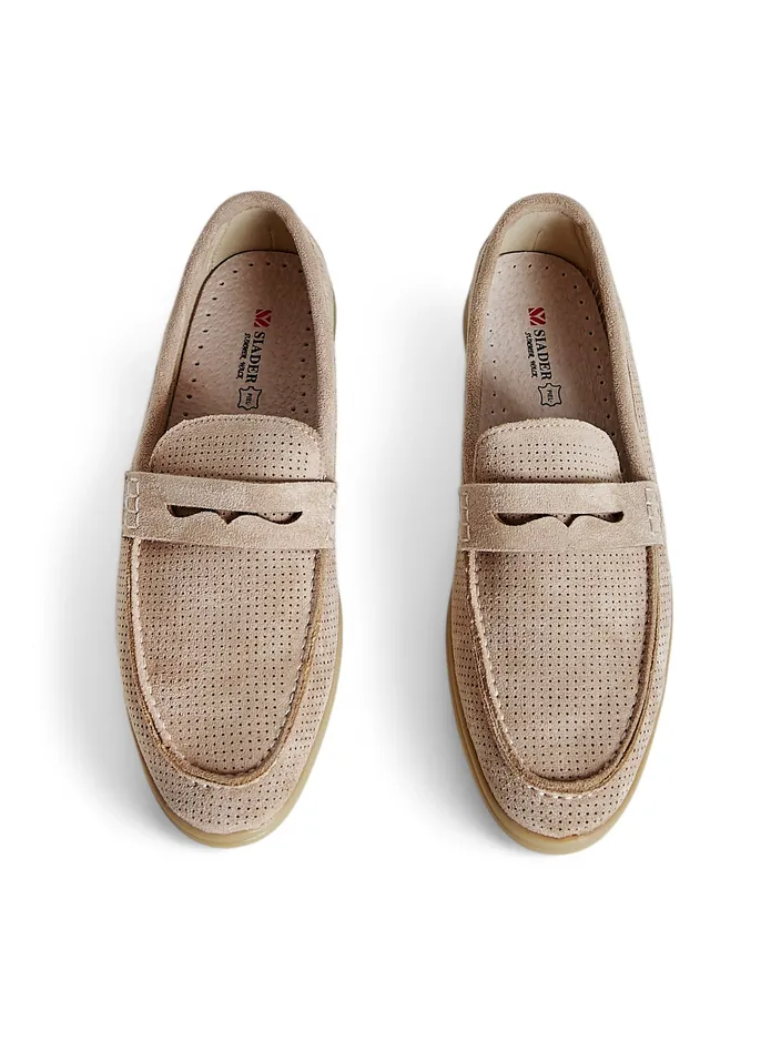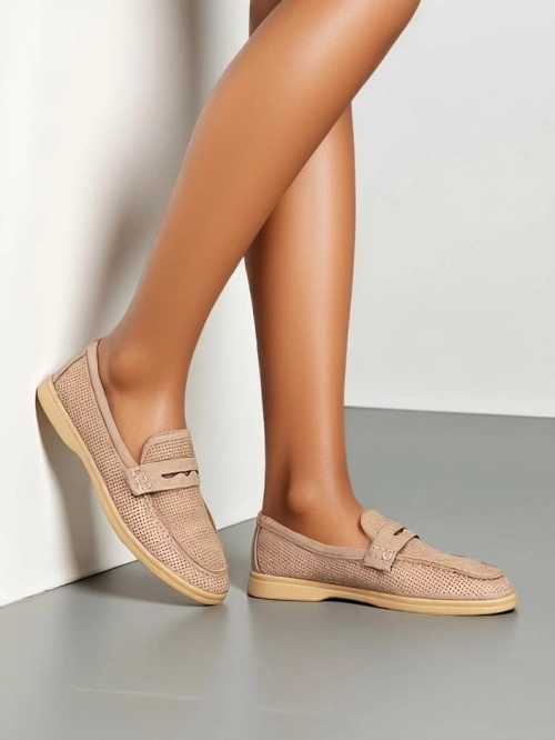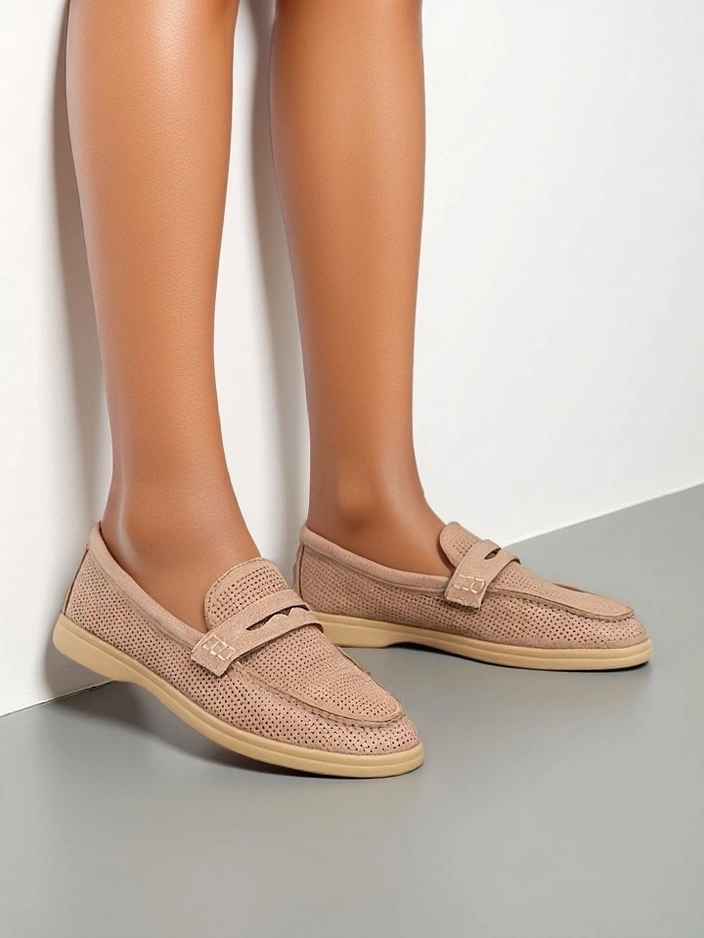 • Perforated women's moccasins with a flat sole. Model made of eco-friendly suede leather with a lining of natural leather. An ideal addition to everyday outfits!