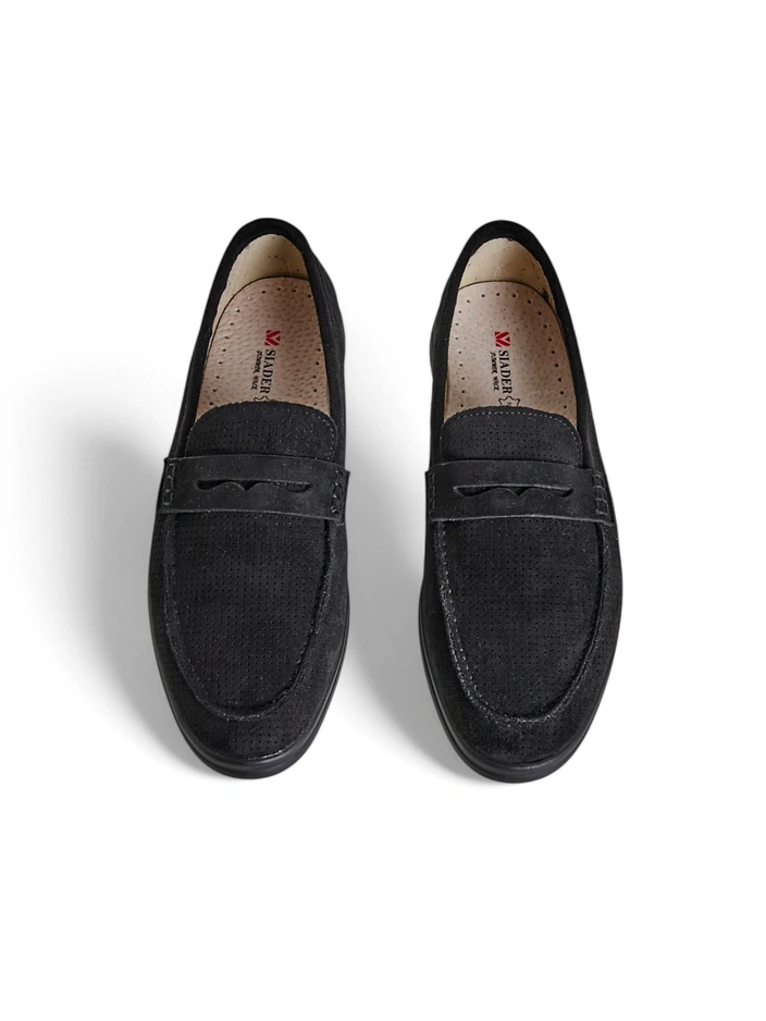 - Perforated women's moccasins on a flat sole. Model made of eco-friendly suede with natural leather lining. An ideal addition to everyday outfits!