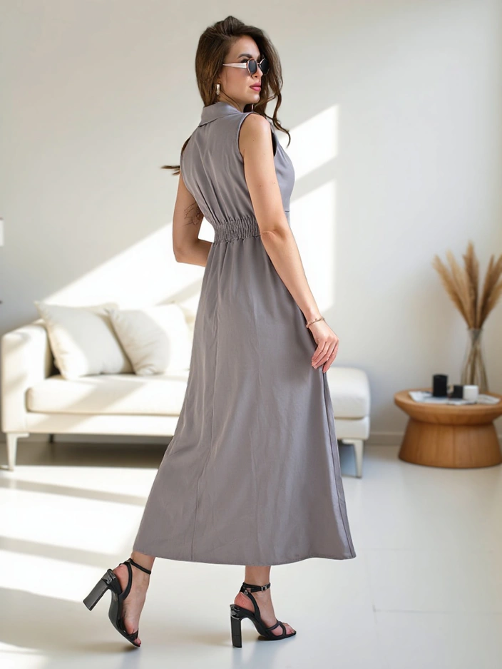 - Women's sleeveless dress with a wrap neckline. The model has an elastic waistband and a flowing bottom. Business elegance! NOTE: Measurement accuracy (+/-) 1 cm.