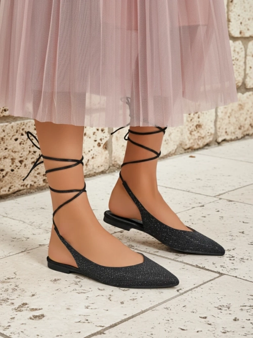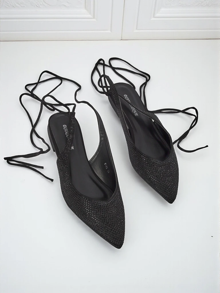 - Unique ballet flats made of fabric covered with zircons with a pointed toe. Model tied with decorative strings. The soft eco-leather insole will provide comfort. Perfect for elegant and fashionable stylizations!