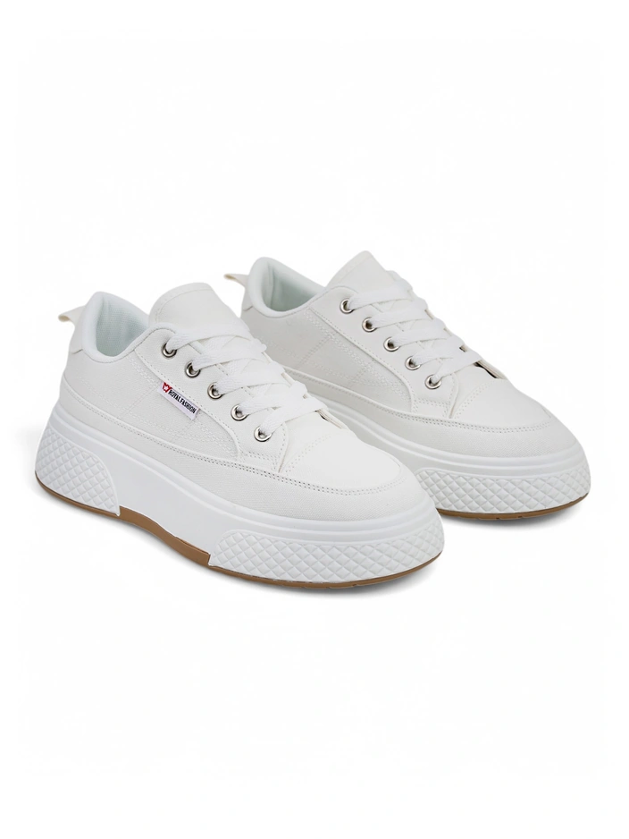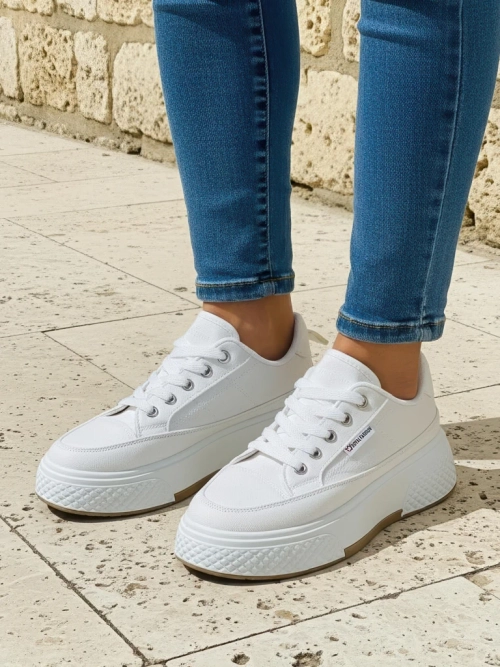 Discover the latest trend in women's footwear - Calypso white platform sneakers! Made of high-quality fabric, guaranteeing durability, lightness and breathability even on hot days. The fabric used in both the upper and the insole ensures breathability and protects against unpleasant odors. The thick, 4.5-centimeter platform sole is made of modern, shock-absorbing materials that minimize foot fatigue and ensure wearing comfort throughout the day. The production process of the sneakers is a combination of modern technologies and attention to detail - the stitching reinforces the structure, and the solid laces and metal eyelets increase the durability of the shoes. The shoes do not contain any animal-derived elements, which makes them a great choice for vegans and people who consciously choose cruelty-free products. Thanks to the universal white color and modern platform style, Calypso sneakers are a great addition to any outfit. The combination of fashionable design and comfort makes them ideal for everyday wear, school, work, a walk or a trip. The classic cut with a sporty character fits into current trends, where minimalism and retro inspirations dominate. 1. Wear them with skinny jeans and an oversized sweatshirt for an urban, casual look. 2. Combine with a light dress or midi skirt and a denim jacket - you will create a girlish styling for spring or summer. 3. For the office or a meeting, choose cigarette pants, a classic T-shirt and a jacket - white platform sneakers will add a touch of casualness to the styling without losing elegance. To enjoy the pristine white color for a long time, it is recommended to clean the shoes regularly with a soft brush and lukewarm water with soap. Avoid drying in full sun or in a washing machine. Put paper in your shoes when they are not being worn to maintain their shape. Store in a dry and airy place. These shoes are a must-have for the spring-summer-autumn season. Calypso platforms perfectly fit into the fashion inspirations visible on the streets of European fashion capitals, and their comfort makes them quickly become your favorite wardrobe item!