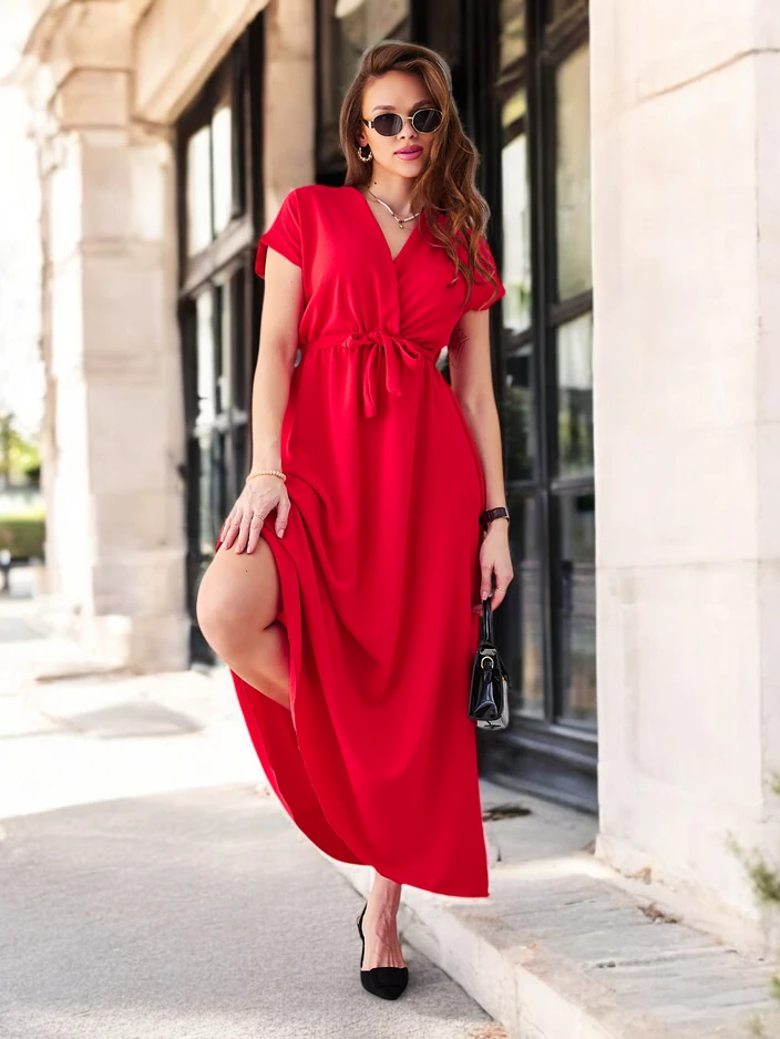 - Women's midi dress with an elastic waist. Model with short sleeves, wrap neckline, and a belt. A must-have in your wardrobe!