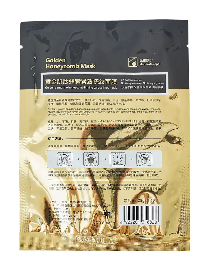 • The gold sheet mask with honeycomb structure moisturizes, nourishes, and regenerates the skin, leaving it smooth, radiant, and full of glow.